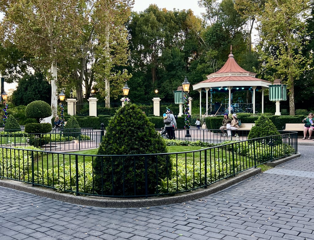It has shaded bench seating, a relaxed atmosphere, and enough space to take a break from the flow of World Showcase.